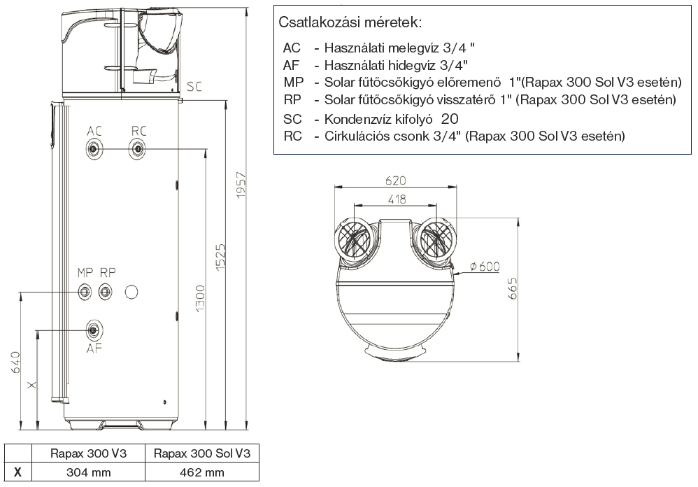 - Beépített fűtő csőkígyó külső hőforrás csatlakoztatásához: például kazán vagy napkollektoros rendszer (300 SOL típus esetén)