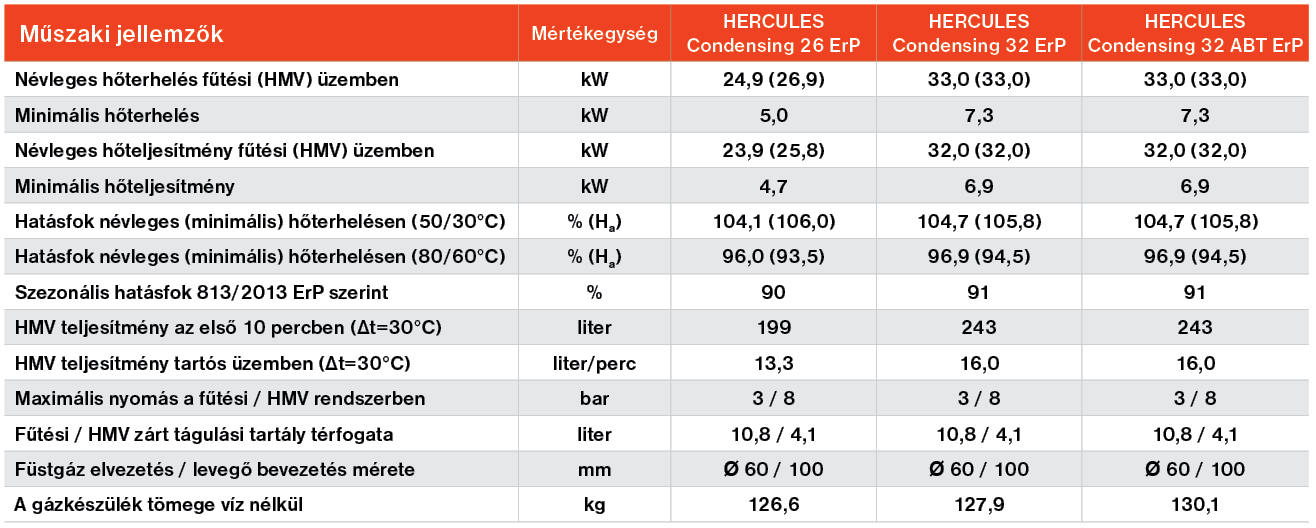 A HERCULES Condensing 32 ErP típusú álló, kondenzációs elven működő gázkazán 32 kW teljesítménnyel képes fűtési és használati melegvizet előállítani. A készülékek 120 literes, rozsdamentes acélból készült beépített használati melegvíz tárolóval rendelkeznek. A tároló a készülék alsó részén helyezkedik el, fölötte a gáz berendezések illetve a hidraulikai egységek találhatók. Ennek az elrendezésnek köszönhetően a készülék kompakt méretű. A HERCULES Condensing ErP kazánok többzónás rendszerben is alkalmazhatók, zónánkénti szobatermosztátos szabályozással. Az opcionális bővítőkészletekkel legfeljebb három fűtési zóna kilakaítása lehetséges, melyek közül kettő keverőszelepes (alacsony hőmérsékletű) is lehet. A HERCULES Condensing ErP készülékek nagy vízterű fűtési rendszerekhez is alkalmazhatók. A tároló két fűtőcsőkígyója révén napkollektoros rendszerrel is összeköthető. A készülék az (opcionális) Super Amico távszabályzóval könnyen és gyorsan, a készüléktől távolról is vezérelhető. Külső érzékelő (opcionális) csatlakoztatása esetén időjárásfüggő szabályozás (alap felszereltség) használata is lehetséges.
