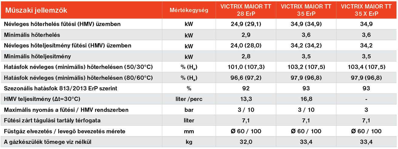 A VICTRIX MAIOR TT ErP család kitűnő választás fűtéskorszerüsítéshez, vagy akár új rendszerekhez való telepítéshez. A teljes sorozatot úgy tervezték, hogy mindenben megfeleljen a legfrissebb európai direktíváknak és mindamellett növelje a kondenzációs technológia elterjedését azáltal, hogy egy könnyen elérhető magas hatásfokú fűtő és használati melegvíz készítő terméket képvisel a lakossági felhasználásban. A TT rövidítés a “Top Tech” azaz csúcskategóriának felel meg. A VICTRIX MAIOR TT kazánok a cég Brescelloban található központjában egy teljesen új, automata gyártósoron készülnek, robotok közreműködésével. Valamennyi kazánt elkészülte után tesztelésnek vetnek alá, ezáltal is garantálva, hogy csak hibátlanul működő készülék kerülhessen ki a gyárból. A kazán fő egységét képző innovatív kondenzációs hőcserélő garantálja a kiváló áramlási tulajdonságokat, illetve a rendszerben keringő szennyeződésekkel szembeni magas ellenálló képességet. A készülék károsanyag emissziója alacsony, így a környezetre gyakorolt hatása is minimális. Fejlett kezelőfelülete által kezelése és beállítása egyszerű és rendkívül felhasználóbarát. LCD kijelzőjének köszönhetően az esetleges hibakódok egyértelműen beazonosíthatóak. A VICTRIX MAIOR TT ErP típus átfolyós üzemben képes használati melegvizet előállítani.